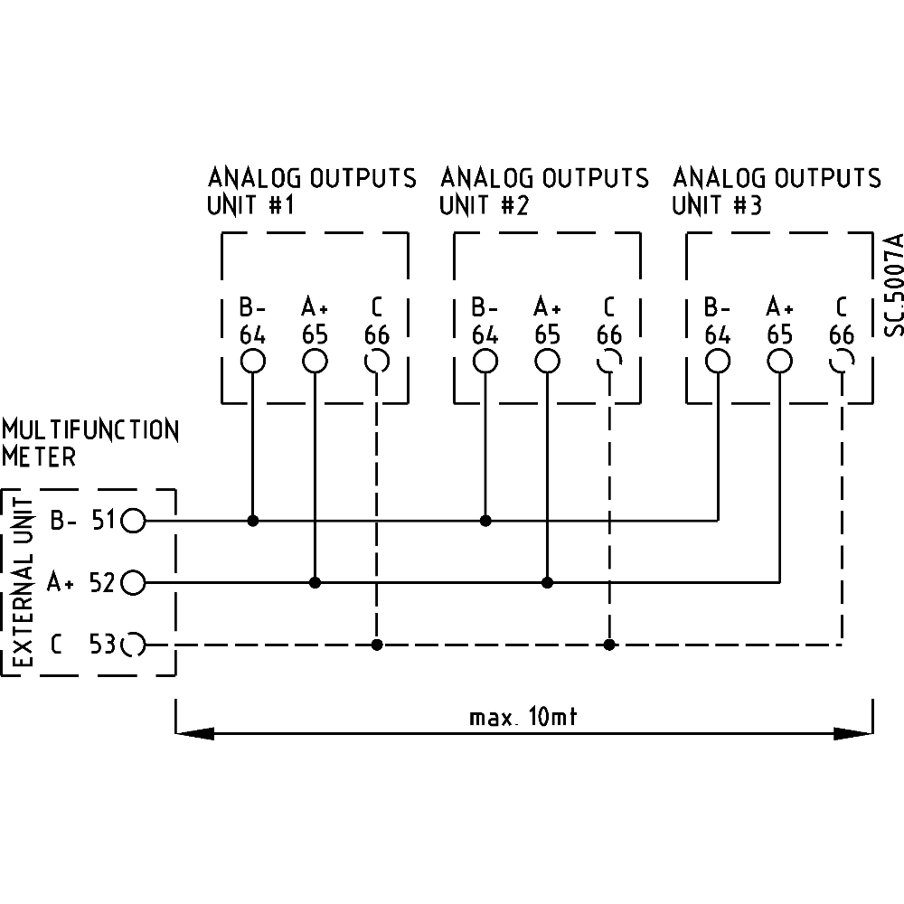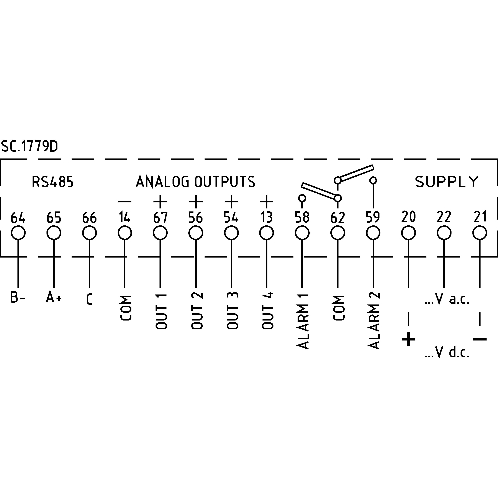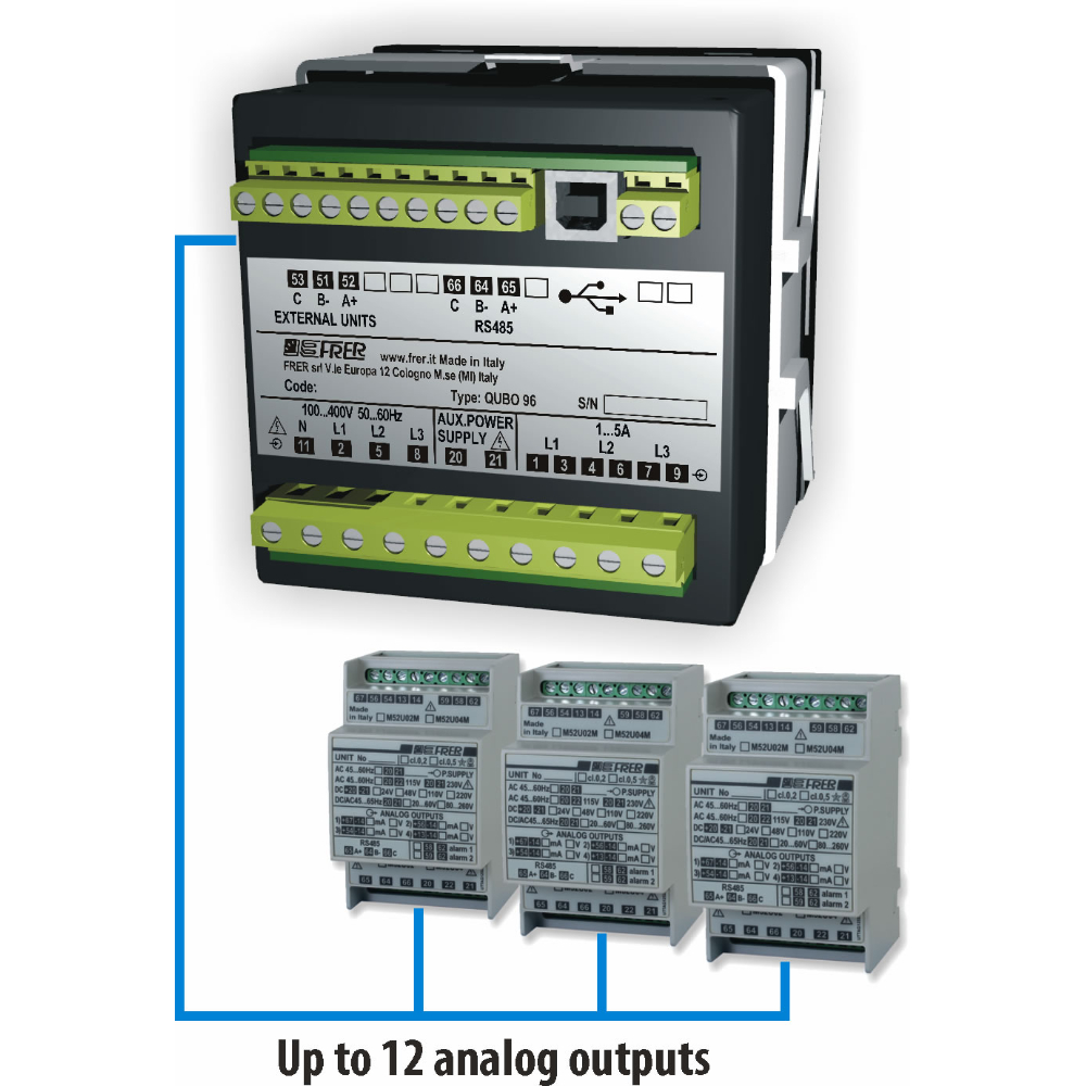 Analogue outputs modules M52U… with 2 or 4 outputs are designed to be connected to FRER multifunction meters to generate a maximum of 12 analogue outputs (using max. 3 modules with 4 outputs) proportional to as many variables measured by the meter itself. In addition, on each module two alarm outputs are available on request. Each analogue output, as each alarm output, is fully and independently programmable on site.