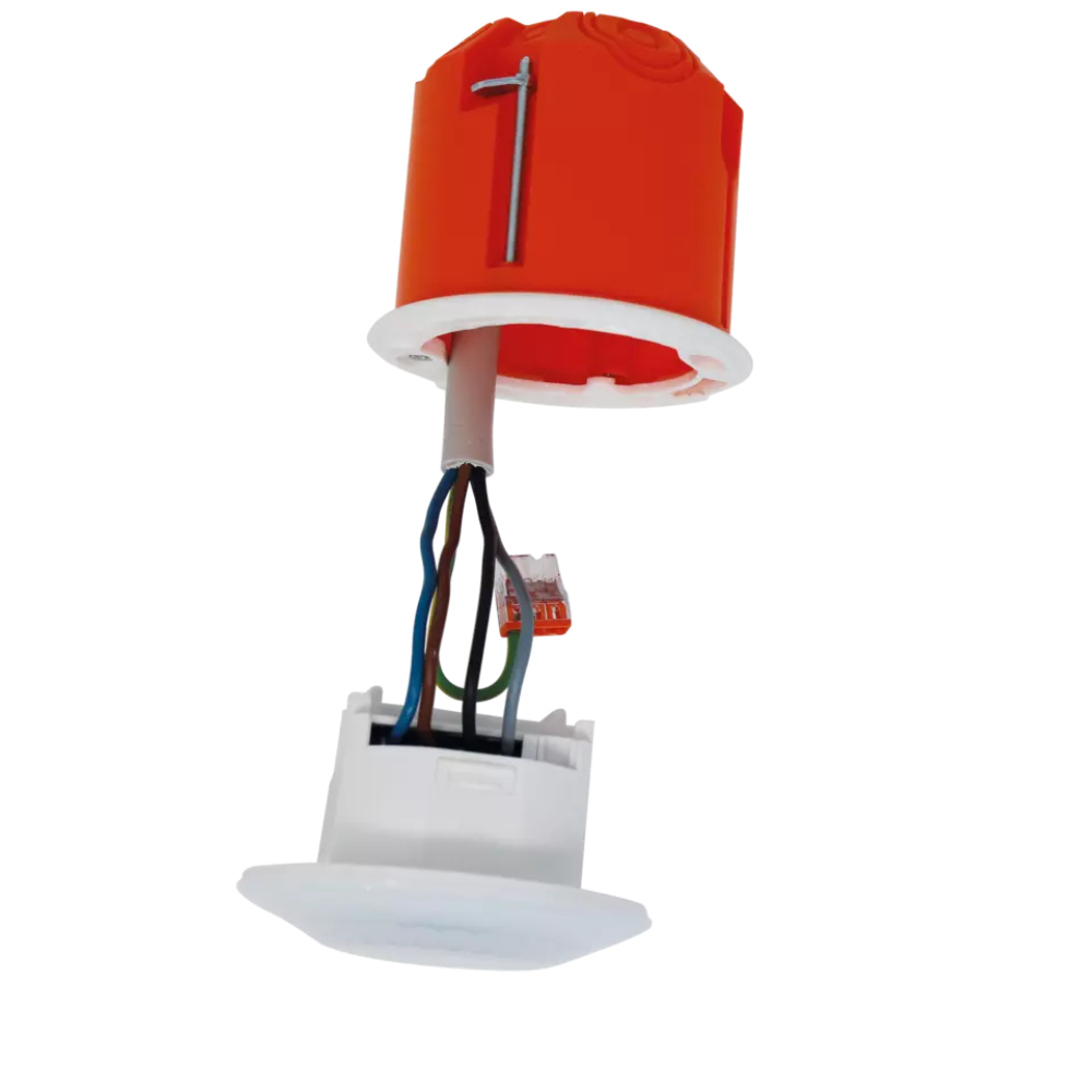 Passive infrared presence detector, ceiling installation as supplied or flush-mounting by means of removable springs/protection cap and enclosed mounting frame