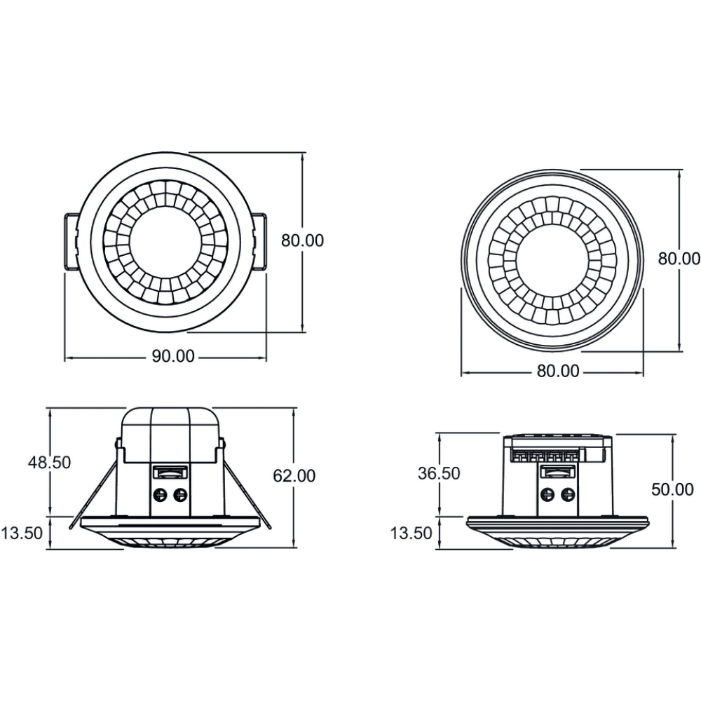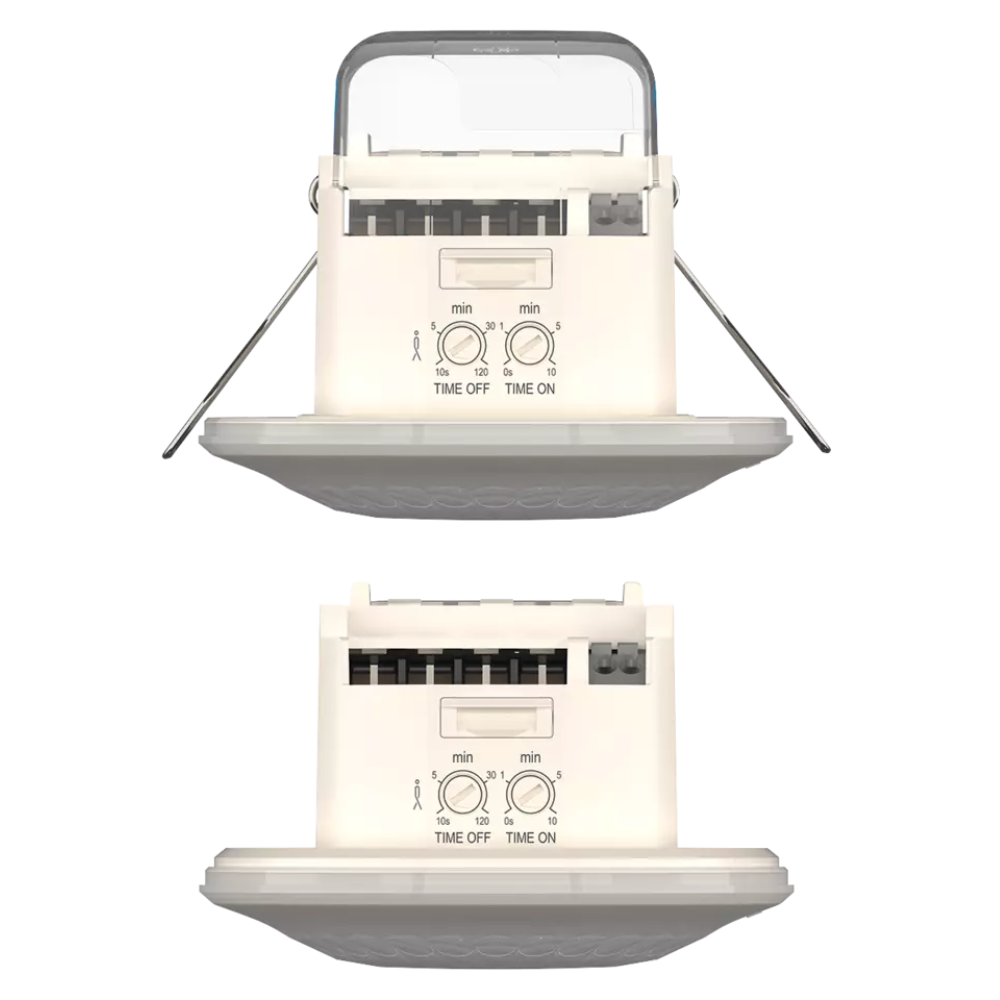 Passive infrared presence detector, ceiling installation as supplied or flush-mounting by means of removable springs/protection cap and enclosed mounting frame